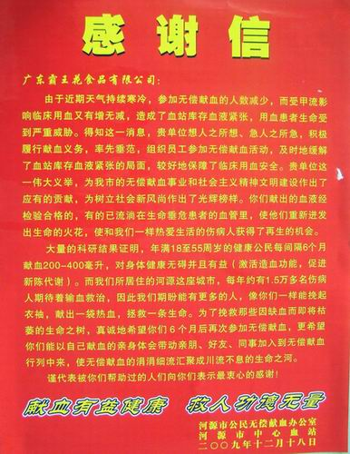 12月20日,我司員工積極到我市中心血站挽起衣袖踴躍參加無(wú)償獻(xiàn)血。昨日血站工作人員為我司送來(lái)了錦旗和感謝信。