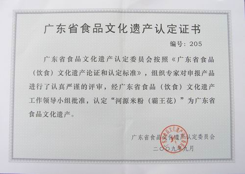 2009年11月20日,“第二批廣東省食品(飲食)文化遺產保護名錄新聞發布會” 在廣州召開。省文化廳杜佐祥副廳長和省食品行業協會張俊修會長、省經信委、省文物局等相關領導,以及文史專家、食品專家、企業代表,南方日報、羊城晚報、廣州日報、廣東衛視、南方電視臺、廣東電臺、《食經》雜志等省內主要新聞媒體記者,共110人出席了新聞發布會。發布會上,廣東省食品文化遺產認定委員會文史、文物專家、廣州博物館名譽館長麥英豪研究員宣讀了《關于公布廣東省食品(飲食)文化遺產保護名錄(第二批)的決定》,并對22家企業頒發了牌匾和證書。其中,我司申報的“河源米粉(霸王花)制作工藝”,因其科學地將傳統制作工藝和現代食品生產工藝有機結合,形成鮮明的嶺南食品文化特色,被成功列為我省食品文化遺產保護名錄,這是“河源米粉(霸王花)”在品牌保護上繼成功申報國家地理標志保護產品、嶺南特色食品之后獲得的又一殊榮。